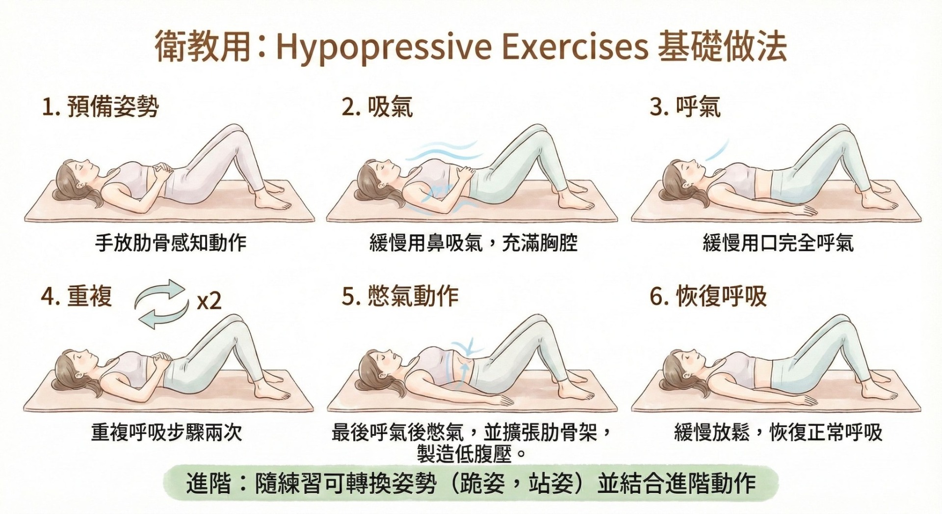 什麼是低腹壓運動?低腹壓運動是一種結合呼吸、姿勢與核心控制 的練習方式。它的特色是:先把氣吐到幾乎吐不出來短暫閉氣讓肋骨向外撐開肚子自然往內、往上收維持固定姿勢(站姿、坐姿、跪姿、四足跪姿、仰躺等)這個過程不需要主動收縮骨盆底肌,而是利用呼吸與姿勢讓深層核心與骨盆底反射性啟動。