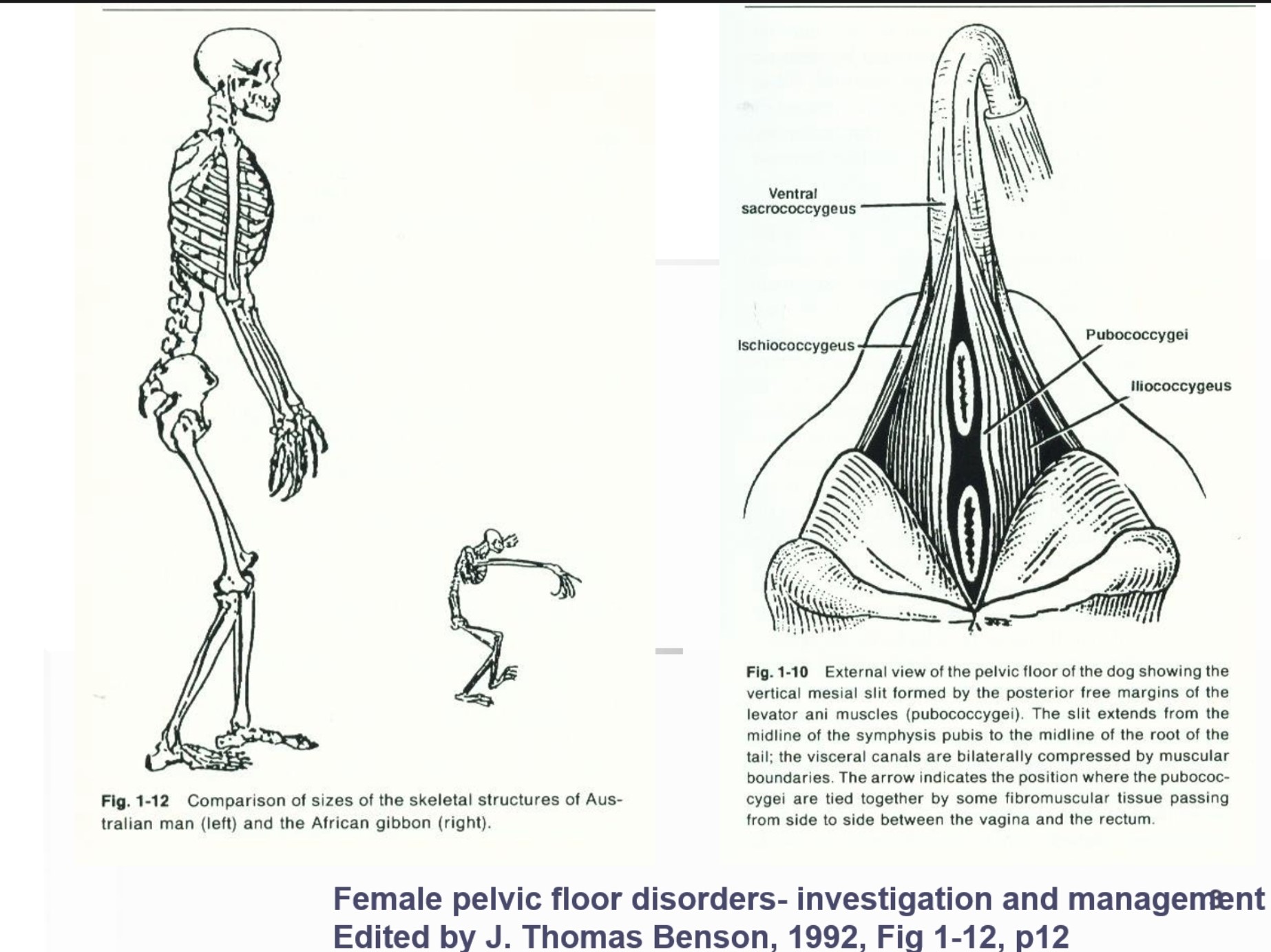 二、 消失的尾巴,留下的「陷阱門」Benson 教授在書中特別標示出犬隻盆底的「垂直正中裂縫(Vertical mesial slit)」。在狗狗身上,這道縫隙不需要承受臟器壓力;但在人類直立後,這道裂縫成了直通體外的「出口」。更糟糕的是,我們在演化中失去了尾巴。狗狗可以用尾巴肌肉(尾骨肌)來輔助關閉盆底,但人類的這群肌肉必須轉化為恆定的張力,24 小時與重力對抗,防止子宮、膀胱從這道「陷阱門」掉出去。這就是為什麼人類天生就存在結構性的弱點。