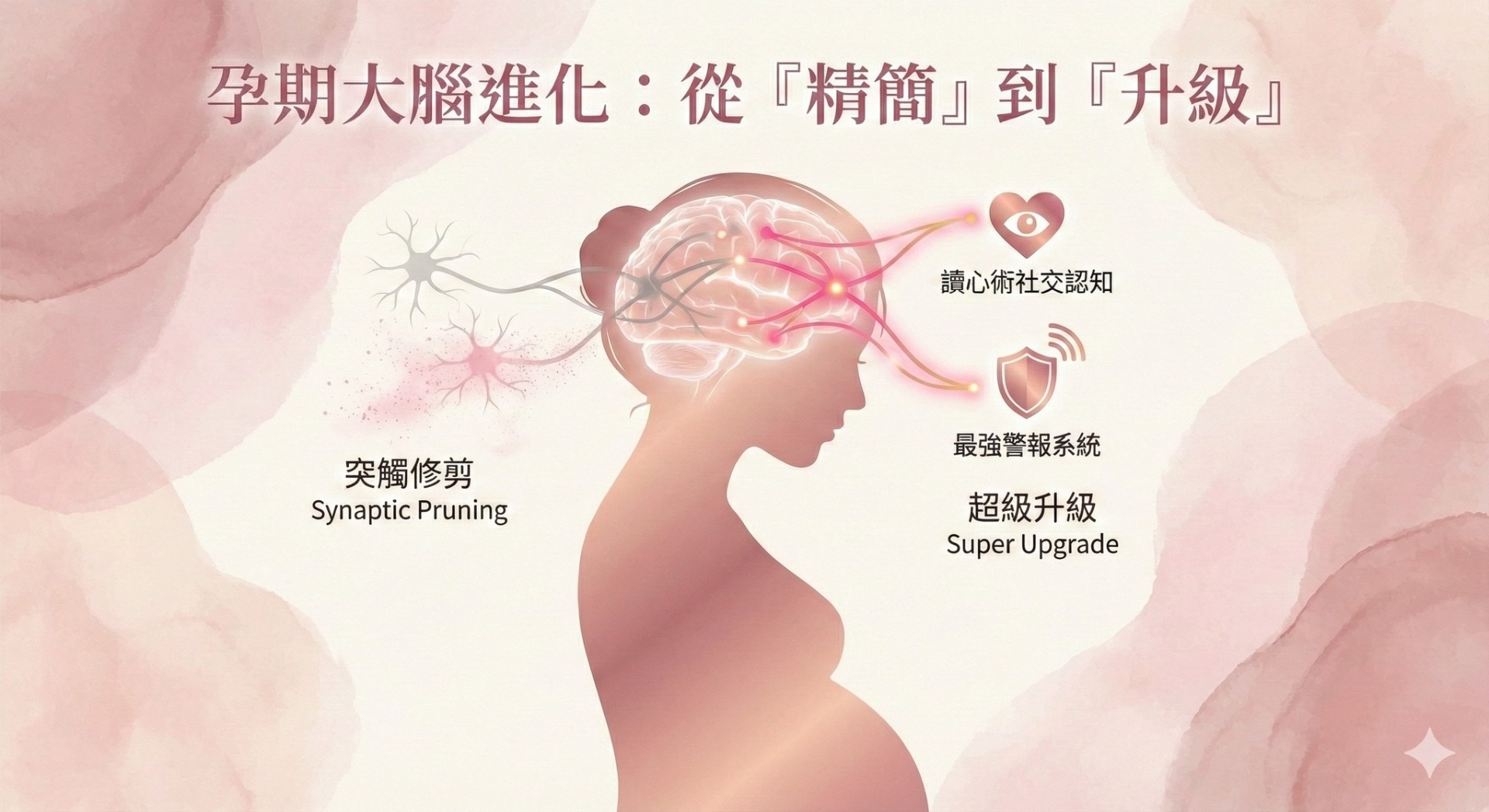 神經科學界有一項震撼的研究(2017, Nature Neuroscience)發現:女性在首次懷孕後,大腦特定區域的灰質體積會顯著減少。這聽起來很嚇人?其實這在醫學上叫做「突觸修剪」(Synaptic Pruning)。
