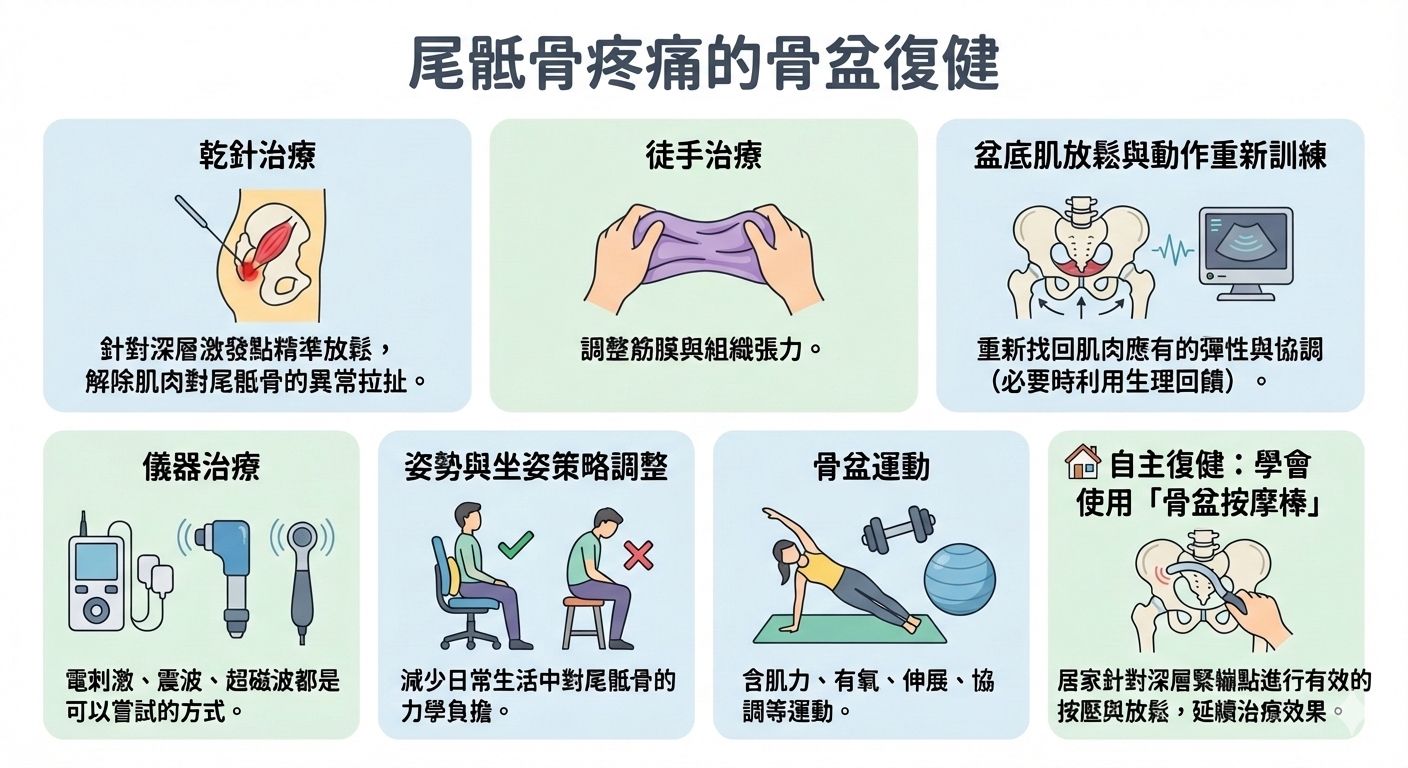 姿勢與坐姿策略調整暨行為改變: 減少日常生活中對尾骶骨的力學負擔,包括緩解便秘及其他不當解尿解便習慣。